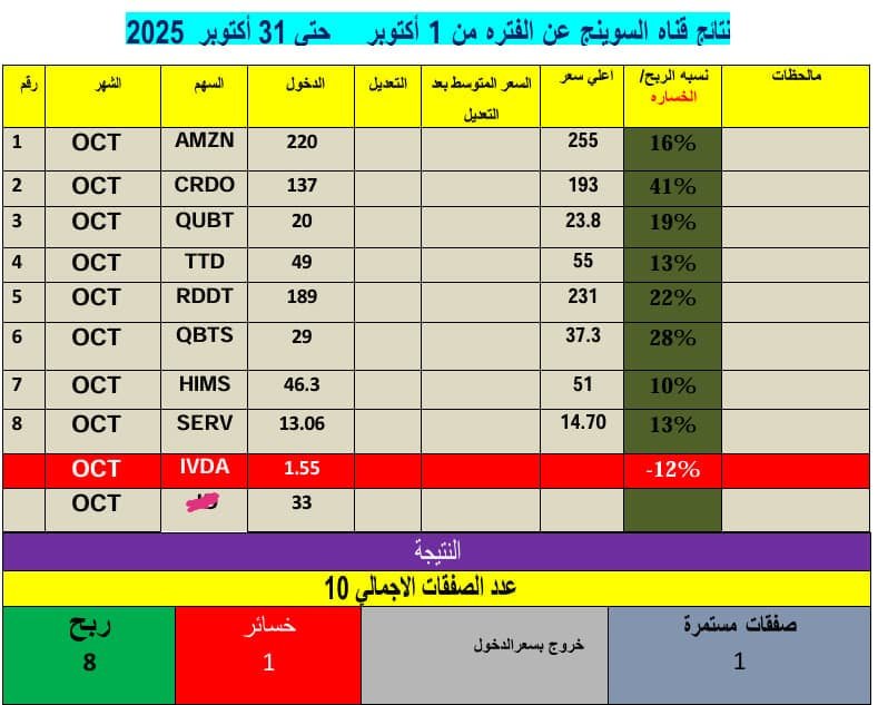 نتائج توصيات القناة الخاصة سوينج أكتوبر 2025: استطاعت أكاديمية صائد الاسهم الامريكية تحقيق نتائج مبهرة, توصيات الأسهم . في إجمالي الصفقات الرابحة بفضل من الله تعالي, وبسبب الاحترافية والخبرة للمحللين والخبراء والباحثين في الأكاديمية, حيث نقدم احترافية على أعلى درجة من الاحترافية والدقة للمستثمرين, وهي تقوم بتغطية الاسواق وأسهم الشركات الرائدة والشركات الناشئة المبتكرة