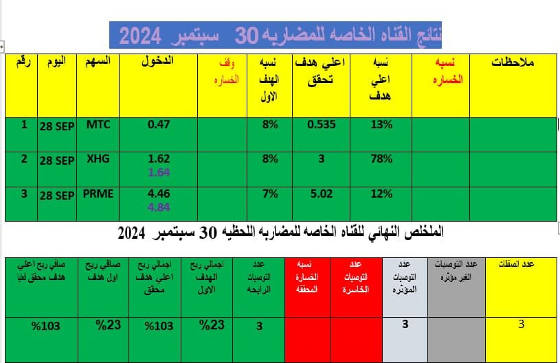 نتائج توصيات القناة الخاصة لتوصيات الاسهم30 سبتمبر 2024 : استطاعت أكاديمية صائد الاسهم الامريكية تحقيق نتائج مرضيه , بفضل من الله تعالي