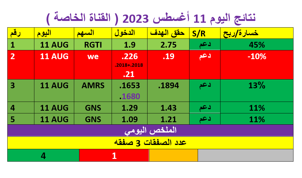 نتائج توصيات القناة الخاصة لتوصيات الاسهم 11 اغسطس2023 : استطاعت أكاديمية صائد الاسهم الامريكية تحقيق نتائج مبهرة, توصيات الأسهم ليوم 11 اغسطس 2023 في إجمالي الصفقات الرابحة بفضل من الله تعالي