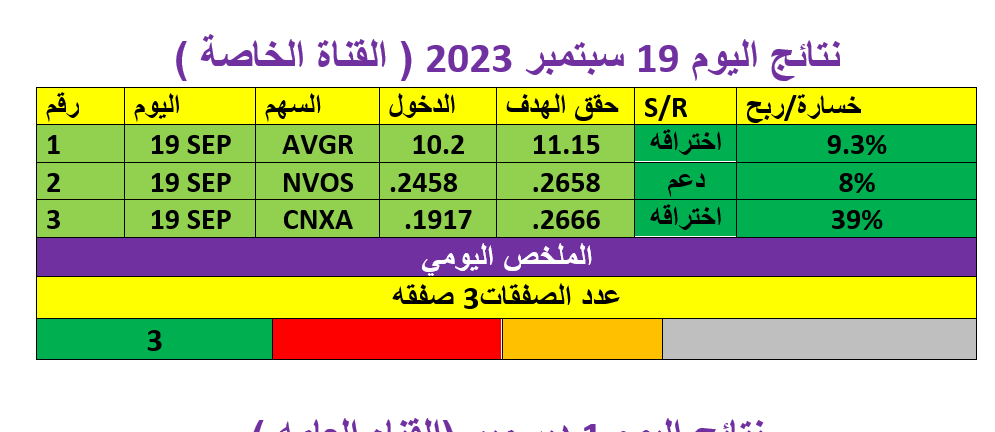 نتائج توصيات القناة الخاصة لتوصيات الاسهم 19 سبتمبر 2023 : استطاعت أكاديمية صائد الاسهم الامريكية تحقيق نتائج مبهرة, توصيات الأسهم ليوم 19 سبتمبر 2023 في إجمالي الصفقات الرابحة بفضل من الله تعالي